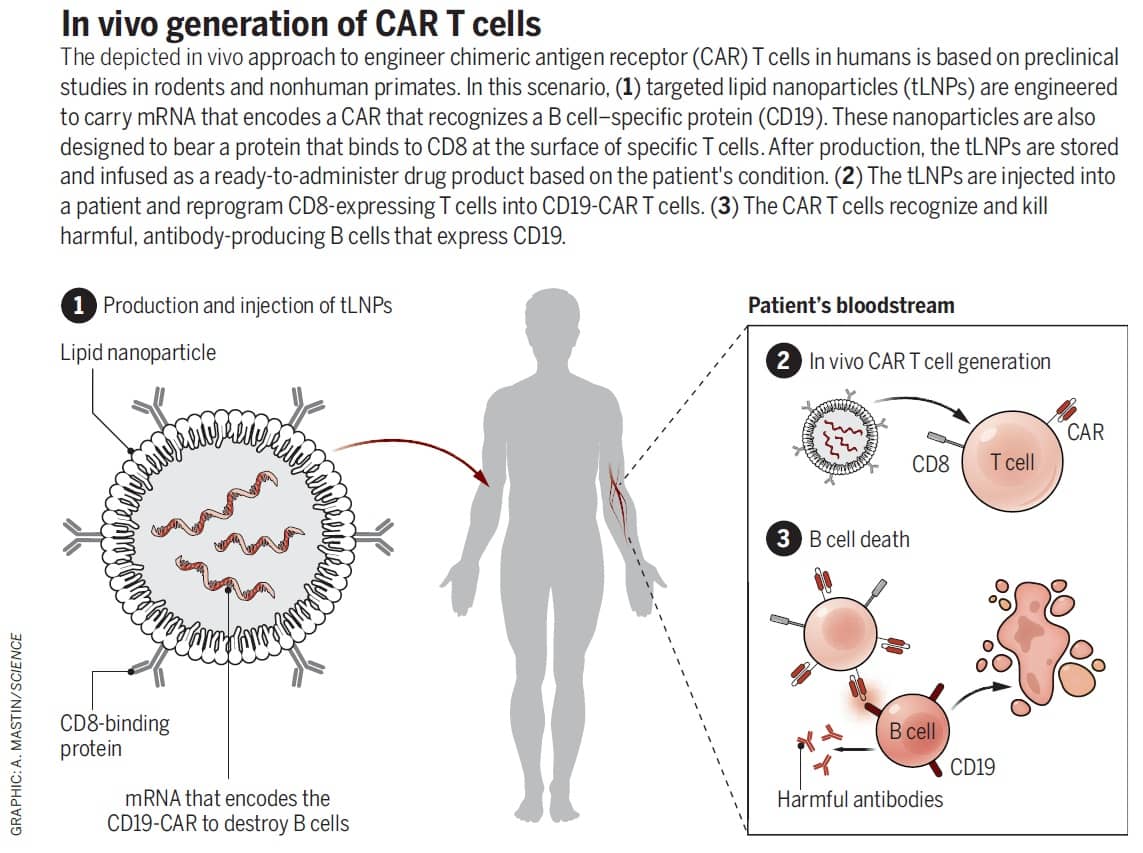 The Capstan approach to CAR-T cell therapy: An IV bag, a targeted LNP, and an mRNA encoding the CAR of interest. Source: Science.