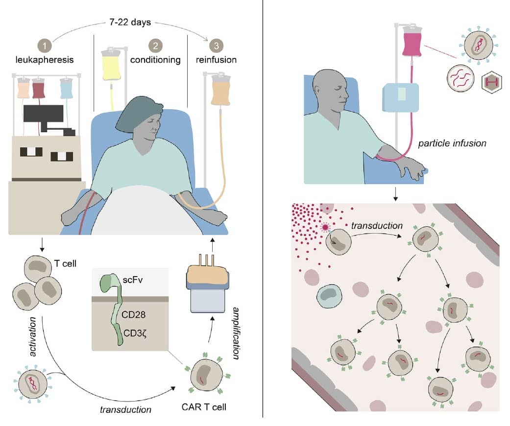 Ex vivo generation of CAR-T cells (left) is a complex and lengthy procedure, entailing isolation of T cells from patient blood (1), followed by activation, transduction, and ex vivo expansion for several weeks. After undergoing conditioning treatment (2), patients are infused with a bolus of expanded CAR-T cells (3). In the in vivo approach (right), delivery vector (targeted LNPs or lentiviruses, depicted as red dots) are infused directly into the patient, where they encounter T cells and selectively deliver genetic material encoding the CAR (red). Source: Molecular Therapy.